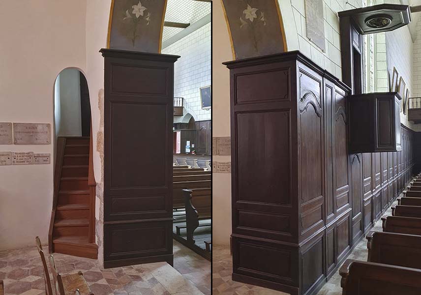 La chaire à laquelle on accède par un escalier qui part de la chapelle sud et traverse le mur.