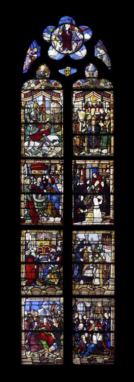 Cette verrière est consacrée à la fois à saint Paul, saint de l'église universelle (côté gauche) et à saint Aldric, saint de l'église diocésaine (côté droit). Saint Paul, titulaire de l'abbatiale avec saint Pierre, occupe dans l'iconographie ferriéroise une place moindre que celle de saint Pierre, le premier des apôtres (princeps apostolorum). Seules la moitié de la verrière et la quintefeuille lui sont consacrées ; elles représentent les cinq épisodes importants de la vie de Paul. |